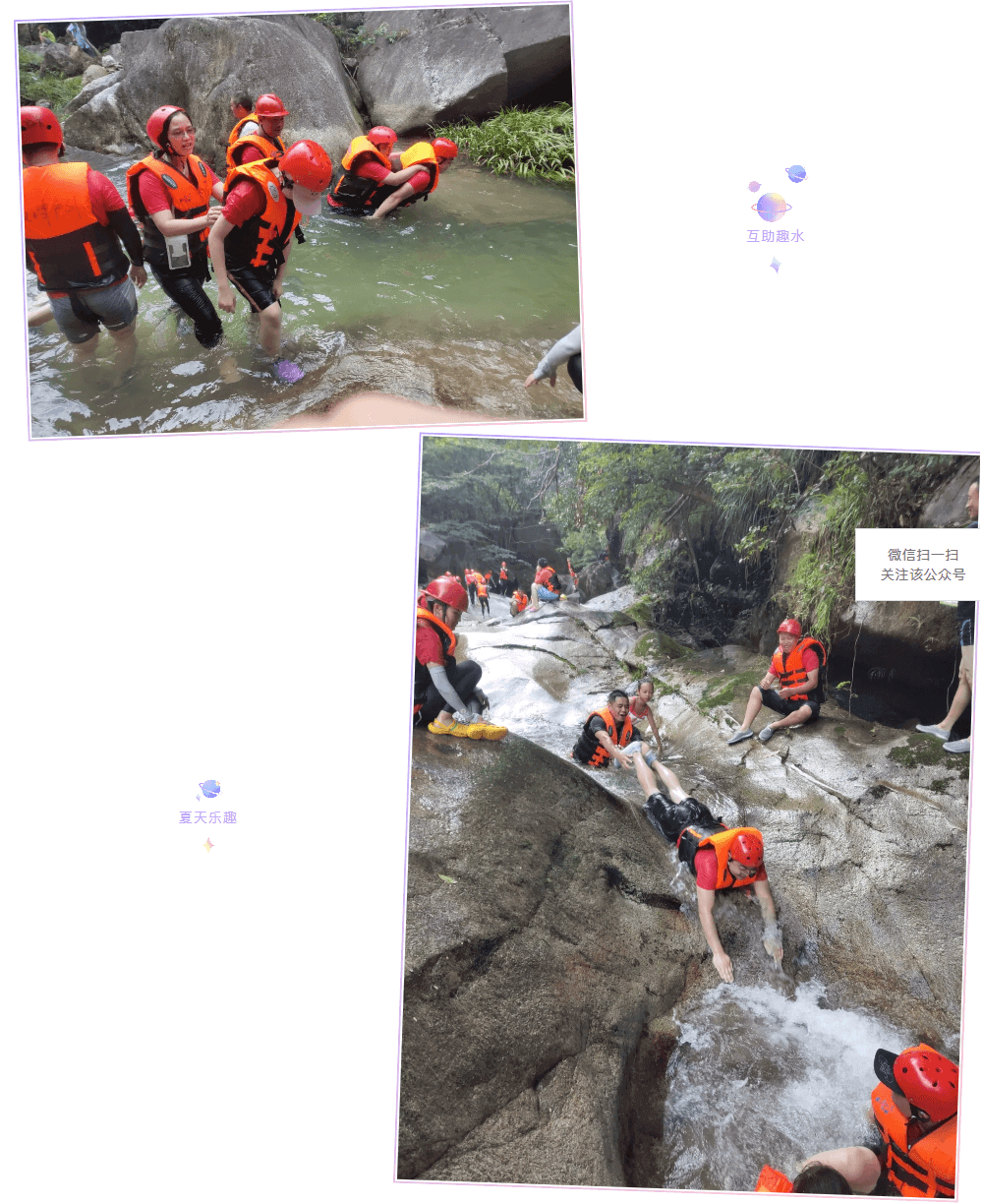 休息片刻,下午大家整裝出發(fā),淺淺的溪水,涼爽的山林溪瀑,都可以在這透心涼的溪瀑中感受冰爽酷翻天的浪味,同事間的友情在互助趣水的玩樂(lè)中得到了革命般的升華。